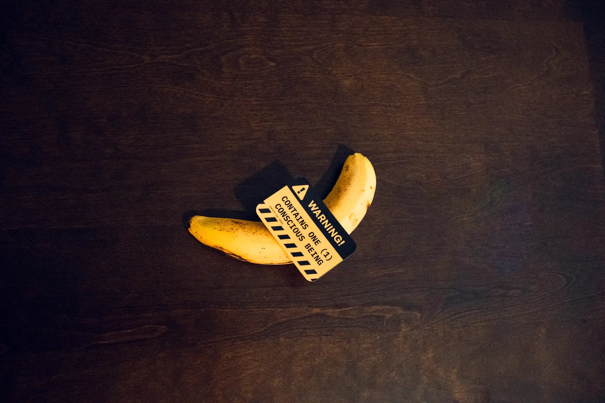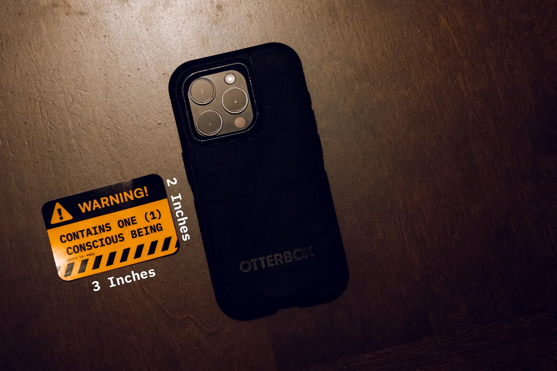 Warning Label Sticker — “Contains One (1) Conscious Being” — 3×2 in Waterproof Vinyl